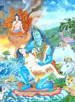 Yet others say that it was the day on which the celestial river Ganga descended on the head of Lord Shiva, Gangadhara. However, the most commonly accepted one relates that the divine wedding of Lord Shiva and Shakti took place on this auspicious night, Maha Shivaratri, the Great Night of Shiva. Legend goes that once Lord Shiva and his wife Sati were returning from sage Agastya’s ashram after hearing the glories of Shri Rama’s advent (then ongoing), and his leela or play as a human being. At that time Lord Rama was spending his exile period in the forest. Desirous to witness the Lord’s leela, Devi Sati asked her husband to take her where Shri Rama was then. The all-knowing Mahadev advised Sati against it saying the Lord's maya is inscrutable and the outcome of interfering in His leela would not be good. Sati insisted and promised that she would not intervene in any way. On reaching near Rama’s cottage in the woods, Lord Shiva saw a disconsolate Rama, lamenting and weeping, desperately searching for his wife Sita, who had just been kidnapped by Ravana, the King of Lanka. Beholding the Lord’s divine play, Lord Shiva bowed his head in reverence to Lord Rama. Devi Sati was surprised by Lord Shiva’s reverential attitude and inquired why he was paying obeisance to a mere mortal. Shiva informed Sati that Shri Rama was none other than the Supreme Para Brahman Shri Hari and his aradhya bhagavan (worshipful Lord). Sati, however, was not convinced and wondered how this ‘man’ grieving and lamenting for his wife, could be an avatar of Lord Vishnu. She told Lord Shiva that she would like to test Rama herself. Lord Mahadeva warned her that it would lead to no good and advised her not to persist. However, impelled by Providence, Sati Mata decided to go ahead and play a little trick. But the damage had been done. Lord Shiva who regarded Shri Rama as his worshipful Lord and Devi Sita as his mother could not now accept Sati as his spouse. Since he had seen Sati in the form of Bhagwati Sita, he could not bring himself to associate with her as as a husband anymore. From that time, Shiva mentally renounced Sati as his wife. Ma Sati was saddened with the change in her husband. Soon after Lord Shiva went into a prolonged Samadhi - 80,000 years long! Ma Sati faithfully continued to serve her Divine Lord for all those long years – often shedding tears at Shiva’s feet wondering why he had chosen to absorb himself in Samadhi rather than be with her. It is said that all of cosmic nature, the demigods and even Lord Brahma and Lord Vishnu wept when Sati cried. Lord Vishnu, the maintaining power of creation, realized that something needed to be done to get Shiva and Sati back together again for the good of the worlds. With the best interests of the universe in mind, Shri Hari set the stage for a divine leela. Accompanied by all the demogods, rishis, siddhas, gandharvas and yakshas, Lord Vishnu and Lord Brahma appeared on Mount Kailash and prayed to Devadidev Mahadev to awaken from his Samadhi as the whole of creation was suffering calamity and grief. Hearing their prayer Ashutosh Mahadeva opened his eyes and all breathed a sigh of relief. The gods urged Lord Shiva to consider Sati’s plight and cohabit with her again. Mount Kailash and the entire universe reverberated with joy. It seemed all was well again. Under the influence of Maya and puffed up with pride, Daksha Prajapati did not care to invite Sati or Shiva to the grand sacrifice because he regarded Shiva as an uncouth hermit not deserving of the honour to sit at the same place where the leading luminaries of the celestial world would be present. But Sati very much wanted to go to her parental home to attend the yagna to which she saw all the demigods, rishis, gandharvas and devas proceeding in their shining aerial vehicles with their respective spouses. She approached Shiva and put forth her proposal that although Daksha had not invited them formally, since he was after all, her father, she did not require a formal invite to go to her own home. Sensing what was to come, Lord Shiva tenderly told her that it was not appropriate to go when not invited and in any case, he would certainly not go. She could do as she pleased. Again Devi Sati decided to ignore the Divine Lord’s hint and proceeded to her father’s abode. To her great dismay, her father ignored her presence and did not welcome her nor even enquired about Lord Shiva. Driven by Providence and piling up offence on offence, at the time of offering the Ahuti to the Trimurti, Daksha had the temerity to not even make the obligatory offering to Lord Shiva, the Soul of the Universe. Legend records that all of creation trembled at this supreme offence – Lord Vishnu and Lord Brahma at this point, disappeared from the yagna knowing that calamity was about to strike. Ill omens began to appear. But the arrogant Daksha disregarded the signs and urged the priests to carry on. Sati’s anger, which was mounting at the series of insults to herself and her divine and blameless Lord, reached its zenith. Struck with profound grief and blazing with anger, Sati walked up to the havan-kund, and stood before her father, her red eyes emitting fire. Uttering these words, Mata Sati sat in yoga-dhyan and before everyone's eyes a bright fire appeared from her forehead and consumed her entire body. Omniscient Lord Shiva meanwhile knew everything that had transpired and became extremely furious when he learnt of Sati’s immolation. Wrenching a matted lock of hair from his head with a great roar, he struck the ground with it and there appeared Veer Bhadra and Maha Kali. Directing them to utterly destroy Daksha’s sacrifice and his men, Lord Shiva also proceeded to Kankhal to retrieve the body of his beloved Sati. Daksha, his kingdom and his hordes – everything was wiped out. The gods trembled as Shiva’s Tandava had the power to destroy the entire universe. Knowing that as long as Lord Shiva held the body o