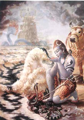 The three represent the three modes of material nature – Rajas, Satva and Tamas. Lord Brahma represents the Rajasic aspect (action/creation), Lord Vishnu the Saatvic aspect (maintaining/ nurturing) and Lord Shiva, the Tamasik (dissolving/ending). Owing to His cosmic activity of dissolution and recreation, the words destroyer and destruction have been erroneously associated with Lord Shiva. People fail to grasp the true significance of His cosmic role. Creation sustains itself by a delicate balance between the opposing forces of positive and negative. When this balance is disturbed and sustenance of life becomes impossible, Lord Shiva dissolves the universe for creation of the next cycle so that the unliberated individual souls (jivas) will have another opportunity to liberate themselves from bondage of the material world. In analogous cyclical processes, winter is essential for spring to appear and the night is necessary for the morning to follow. A goldsmith does not destroy gold when he melts old broken golden jewelry to create beautiful new ornaments. Lord Shiva is the Lord of mercy and compassion. He protects devotees from evil forces such as lust, greed, and anger. He compassionately grants boons, bestows grace and awakens devotion in His devotees. He is quickly appeased and is thus known as Ashutosh. He is also quick to anger but equally quickly forgets it, just like a child. For this quality, he is also called Bholenath. Lord Shiva is the greatest Vaishnava and His Ishta Devata is Bhagavan Sri Krishna. In any leela of Lord Vishnu (Krishna), He is always present in one form or another and seeks ways to serve His beloved Lord.
