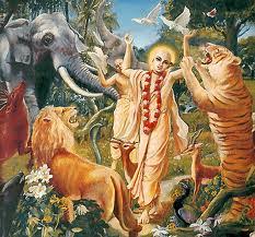 His accompanying attendant recorded how Sri Chaitanya, while walking in a jungle, lost in a mood of divine ecstasy and chanting the Holy Names, encountered tigers on the path. In great horror the servant watched as the Lord approached one of the tigers lying across the path and kicked the animal, commanding it to chant. Soon tigers, deer, and other animals joined in, dancing on their hind legs and chanting the Holy Names of God. In another incident a herd of maddened elephants was made to do the same by the Lord.