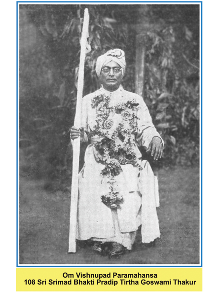 As a child Bhakti Pradipa Tirtha Maharaja was called Jagadisa. After graduating from the Calcutta University, Jagadisa worked as a teacher, living with his wife in Calcutta. His younger brother, Ananta Vasudev, was well-known as Bhakti Prasad Puri Gosvami. Leaving from the Dhubulia railway station on March 25, 1910 AD. Jagadisa, accompanied by Vaikunthanatha Ghosal Bhaktitattva Vacaspati, walked to Mayapura for the anniversary of Lord Caitanya's appearance. There he met Bhakti Vinoda Thakura for the first time. He was sitting near the Mahaprabhu Mandira, delivering a lecture, in the presence of Siddhanta Sarasvati, Jatindranatha, Chaudhuri, the Zamindar of Taki, and other devotees. After being introduced by Vaikuntha Ghosal, Jagadisa fell prostrate on the ground, tearfully seeking the shelter of Bhakti Vinoda Thakur. Acknowledging him, Thakura said: "You are a qualified and respectable person, if you take up the responsibility of preaching on Lord Caitanya's behalf certainly large numbers of people will be attracted to the message." That same afternoon Siddhanta Sarasvati had a long conversation with Jagadisa for several hours. He advised that Jagadisa seek permission from Bhakti Vinoda Thakura to meet Sri Gaura Kisora dasa Babaji who was then staying in Kuliya. Early the next morning