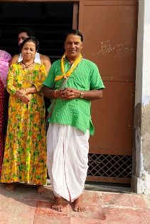 It was midday in peak summer and the kota stone steps all around Radha Kund were burning hot. The accompanying devotees were told to go into Raghunath Das Goswami’s Samadhi temple as it was too hot by the lake. Baba came and sat on the burning stone at Jahnva Ma’s Baithak and went into trance for a good 20 minutes. Even Braj Gopal, well accustomed to walking barefoot on the hot stones, couldn’t stand there for more than 10 minutes. He entered the ghat steps and stood in the water. After 20 minutes Baba opened his eyes and he walked down the steps to do the puja. Hari Gopal Das, now 96 years of age, and his wife live with their other son in Ghaziabad because of his advanced age and better healthcare facilities available there. Braj Gopal Das and his wife continue to live at the same place where Baba stayed, but now in a “pucca’ brick house. He is a Guru Maharaj in his own right and has many disciples in Bengal, Orissa and Maharashtra. Close to his house, Braj Gopal Das has constructed a yatri nivas (pilgrims’ lodging quarters), where in this 2022 Kartik month, he is providing free accommodation and meals twice a day to pilgrims who are on Govardhan/Radha Kund parikrama. He also gives Bhagavat katha pravachan (spiritual discourses) every evening there.