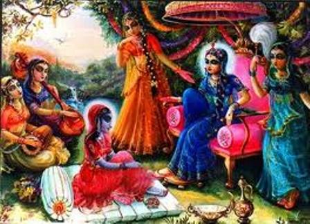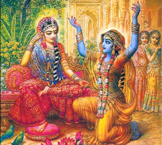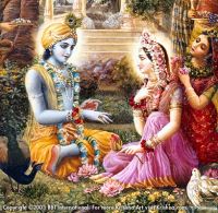 "If Krishna sometimes doesn't come at the meeting place, then I know He must have met some obstacle. Even though His mind is fixed on Me He may feel obliged at times to enjoy with some other gopi, being compelled by her. He will not feel happy with her, but would be burning in a fire of misery the whole night. For this pain of His I am again very sad. I will cry, thinking: 'My dress, ornaments are all useless!' You have all experienced that.” "Then when Krishna humbly comes to me in the morning I will angrily tell Him : 'Go back and enjoy with that other girl.' But that is also all for His pleasure. Such are the ways of love in Vraja.” "But when a gopi is burning in the fire of separation, she reveals her prema by singing verses like : ‘Oh dearly beloved! Your lotus feet are so soft that we place them gently on our chests, fearing that your feet will be hurt. Our life rests only in you. Our minds, therefore, are filled with anxiety that your tender feet might be wounded by pebbles as you roam about on the forest path." "In this way she clearly expresses her unmotivated love for Krishna. Although the life-airs are unable to penetrate the deep darkness of this great separation, the lamp of prema shines brightly in it, because the oil of great affection nourishes it.” "After abandoning the gopis in the rasa dance He also left Me. Listen to why He did this. The Prince of Vraja is an ocean of divine love, and He considers me to be the greatest of His lovers. I can never take offense at His behaviour.” "He seated me on a divine throne of matchless good fortune and adorned me with many kinds of jewel-like pastimes, wandering from one forest to another with me, and enjoying loving pastimes with me without remembering any other gopi. Then I thought to myself: ‘My girlfriends cannot see this great nectar-ocean of bliss. Where are they now, afflicted by separation? Ah what shall I do? If we stay here any longer, the sakhis who are wandering here and there looking for Us will soon find Us.' “Thinking like this, I told Krishna: “Dearest one, I cannot walk any further.' And we sat down for a moment. Krishna, the crown jewel of clever pranksters, and the foremost relisher of transcendental mellows, knew what was on My mind and thought to Himself: 'If I wander through the forest with Srimati Radharani there will be no happiness. All the gopis will become sad, and if we both wait for them here they will find us and chastise us for leaving them. Then all our lilas will stop for the night and the gopis will go home without dancing the rasa dance with me.' "Therefore He left me, so that the gopis would put the blame on Him instead of me, and they would love me in all respects. He thought: 'they will be absorbed in an ocean of amazement after seeing Her matchless fever of separation from me. The pride of their love for me will be diminished and they will see how Radha is billions of times better than all of them, in the mood of union and in separation.’ "He thought: 'They may think that I am lusty, and that is why I left them to play with Srimati Radharani, although their love for Me is much greater than Hers. Thus they may accuse us. But when they are burned by the flames of separation from Me that burns Srimati Radharani, as they come closer to Her, they will realize that these flames are much more intense than the insignificant fires of their love.’ "He thought: 'I want them all to unite, and in this way my desire will be fulfilled. At the same time they will not be jealous when I later dance in the middle of the circle of the rasa dance, with Srimati Radharani as the central gopi.’ "O Goddess. Thinking like this, Krishna affectionately carried me on His chest for a while and then said: 'Dearest One, just wait here for a moment.' Then He placed me behind in a soft place. "When Krishna saw how upset I was about this He felt very sorry, but just as He was about to return to console Me, My girlfriends came and found Me there and comforted Me in My mood of intense separation.” "In reality, Krishna didn't do anything wrong by killing the demons Arishtasura, Bakasura, Aghasura, Vatsasura and the deceitful Putana, because they were killed by the power of Lord Vishnu, who appeared in Him (Krishna) to protect the devotees. Sri Krishna's transcendental feats, like killing these demons and lifting Govardhana Hill proved Garga Muni's words to Nanda Maharaja that Sri Krishna is equal to Lord Narayana in qualities.” “But, O devi, Lord Narayana cannot equal Krishna in form, attributes and sweetness. That is what I understood from the words of Garga, the best of the Munis." Hearing these beautiful words of Srimati Radharani, Lord Hari eagerly said: "I know that you are the only reservoir of the prema you have just explained. O dear friend! The essence of your ambrosial talks about prema is that it makes the lover's faults look like good qualities, it makes the misery of the lover seem like the delightful taste of nectar, it makes one incapable to stand even the slightest misery that the lover may feel, it makes one unable to give up one's body and it makes the lover seem glorious even though he may not be glorious at all. That is prema, O Radha, and you are the only refuge of that prema, just as I have heard in in Devi Parvati's assembly.” "But, O sakhi! I fear Hari does not have the same love for you. That I can see from his activities! Therefore my heart burns when I see your heart burning in a forest fire of misery. How can we believe your clarification of why He left you in the rasa dance? We have never heard this from Him, nor from His friends. And when did they ever speak the truth?” Srimati Radharani said: "Sakhi! I know exactly and instantly what is on my beloved’s mind." Lord Krishna replied: "Really?! How could you know? Have you studied the Achyuta yoga scriptures, so that you know how to enter other people's bodies?" Srimati Radharani said: "You are a demigoddess, therefore y