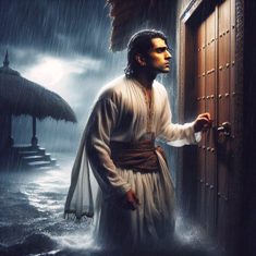 Information about the date of birth of Shri Bilvamangal is not available, but it is popularly held that he was born in South India in the 8th century in a well-to-do Brahmin family. Spiritual Initiation Shri Bilvamangal took initiation in the Vishnuswamy sect from Somagiri, who was his spiritual master. Somagiri gave him the name ‘Lilashuk’. In his previous life, Bilvamangal was a sanyasi and a great devotee of Lord Krishna. He was at the level of Bhava (having intense love for Krishna). He was fond of organizing Bhagavatam katha festivals after which he would distribute prasad to all the people who participated. Once while organizing the festival, he spent all his money. He needed more money to feed the devotees. So he went searching for money. Walking around he saw the cremation of a young princess who had died at the age of 18. Her grief-striken father, mother and many citizens were there. The father lit the fire and then everyone left. The princess was burning with many precious golden ornaments and gems still on her body. The Sanyasi (Bilvamangala Thakur) saw all this and thought, “What is the use of all this valuable jewellery to the dead body of a princess? Better take all this and use it in the service of Lord Krishna and devotees.” So He approached the dead body and tried to take the ornaments but then he heard a voice, "Stop ! Don't take this!" It was the voice of the dead princess. The sanyasi was shocked. "If you need wealth then go to my father the King. Tell him that I have sent you. Under my bed, there is a box with great treasure. Ask my father for that wealth and use that to serve the devotees and Lord Krishna", thus spoke the dead princess. Bilvamangala went in haste to the King and revealed what had happened. The King looked and really found a treasure box under the bed of the princess. The King gladly donated the wealth to the sanyasi. Bilvamangala went and spent all the wealth on the Bhagavatam festival. But in the end, again there was a shortage of money. So he went once again to the cremation place of the princess and took the diamond necklace. As he was going he heard the voice of dead princess, "You have made a great mistake by taking this necklace. I curse you that although you are so advanced in love for Krishna, you will have to take birth one more time and live an immoral life." In his next life, the sanyasi was born as someone who is greatly attached to women. The princess also took birth again as the prostitute Chintamani. Bilvamangal was a very rich man and very much sensuous. He kept a prostitute named Chintamani. He was so much devoted to her that once when he was performing his father's death ceremony, he kept telling the priest, "Please, make haste. Hurry up! I have to go. I have to go." (He had to go to Chintamani’s house) Then there was the ceremony of feeding people. He selected the best foodstuff and putting it in a bag, prepared to go to Chintamani’s house. But when he came out of his home, it was raining torrentially. He didn't care for the rain. He went to the river but there was no boat and the river was raging with tumultuous waves. He thought "How can I go to the other side?" Somehow, fixing his mind on his paramour he swam across the river and reached the other side. Chintamani thought, "Oh, it is raining today, Bilvamangal may not come." So she closed the gate and went to sleep. When he came to the house he saw the gate was closed and it was raining still. So he climbed over the wall by holding on to a snake (mistaking it for a rape in the darkness), and went to the prostitute. She was astonished at seeing him and asked "How did you come here?" Bilvamangal described everything. Chintamani said, "My dear Bilvamangal, if you would have loved Krishna as much as you love me, you would have attained supreme bliss." These words of Chintamani struck him. He immediately left and went away.