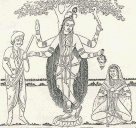 Sometimes Goddess Durga is also described as the Supreme Controller. This is also correct because there is no difference between the potencies and Lord Krishna, the shakti and the shaktiman. Paurnamasi Devi In Krishna's eternal pastimes, Paurnamasi-devi is the expansion of the Lord's Yogamaya potency. She makes the arrangements of Lord Krsna's pastimes to be properly performed. She is slightly tall in stature and has a fair complexion. Her hair is the color of kasa flowers and she wears red garments. She is greatly respected by Nanda Maharaja and all the other residents of Vrajabhumi. She was the dear student of Devarsi Narada and on his advice she left her favorite son, Sandipani Muni, in Avantipura and came to Gokula, impelled by great love for her worshipable Lord Krsna. Baba used to say that Goddess Kali's thick black hair signifies the darkness of maya. It is like the curtain between two realms - the spiritual and the material. Once when someone asked him how to overcome maya, Baba smiled and said don't try to overcome maya - you cannot. But if you seek her shelter with a desire to serve Sri Radha Krishna, she will herself take you beyond maya. Baba used to recount the following story very expressively: once in Vrindavan, Srimati Radharani was dallying with Krishna in a nikunj. Jatila Her sister-in-law, suspecting that She was with Krishna in the grove went and informed Ayan her brother. An enraged Ayan marched over to the kunj swearing profanities and vowing to teach his 'wife' a lesson. When Srimati Radharani heard him approaching She implored Krishna to leave but He assured Her that all would be well. When Ayan barged into the kunj, what does he see? Srimati Radharani is devoutly engaged in worshipping Kali. Thus Krishna becomes Kali.