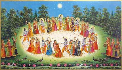 What do the words “Raas Leela” mean? Raas is derived from the word “Rasa” which inadequately translates into “mellow” or “relish” or literally “juice”. Mellow or juice of what? Joy – pure condensed bliss. And Leela means play or sport. Thus Raas Leela means Joyous Sport or more poetically, the esoteric interplay of divine blissful mellows.