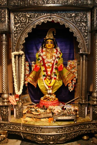 After Vishnupriya-devi’s disappearance her cousin took the deity to his house. At that time he was living on the eastern side of the Ganga. Later on when his house was washed away by the Ganga he moved to Kuliya-grama on the western side of the Ganga. This Kuliya-grama is known today as the town of Navadvipa. As Sri Gauranga Mahaprabhu was the son-in-law of this family, they still to this day worship the deity as their son-in-law. Just as Bhagawan Ramachandra, who had taken the vow of monogamy, had a golden statue of Sita devi made after Her exile to the forest, rather than marry a second time, so Vishnupriya repaid her debt to her Lord in the pastimes of Gaura-Narayan by having an image of Mahaprabhu created so she could perform the sacrifice of the Holy Name to Him. The image of the deity she installed and worshipped is given here. This deity is worshipped to this day in Navadvipa. Srila Bhaktivinoda Thakura relates the following pastime in his Sri Navadvipa-Dhama-Mahatmya: During his exile in the forest for 14 years, Lord Rama visited Ramkeli, Gangasagar and Navadvip areas of Gaud desa. Once as Lord Rama was observing the extraordinary beauty of the forest, He began to smile. Sita asked Him why He was smiling, and Sri Rama replied, "In this forthcoming Kali-yuga, I will take birth from the womb of Mother Sachi in Sri Jagannatha Mishra's house in this same Navadvipa-dhama. People will know Me as Gauranga, and I will charm everyone by performing a variety of enchanting pastimes. I will manifest the glory of the Holy Name and thus madden the common people with the chanting of these names. I will change the hearts of even hardened sinners and give them love of God, which even the demigods rarely attain. In My youth I will accept sannyas, after which I will reside in Sri Jagannatha Puri. At that time My mother Sachi-devi, who is none other than Kausalya, will weep holding her daughter-in-law Visnupriya in her arms. You will be that Vishnupriya. I will thereafter remain in Puri and will also weep for you day and night". By her devotion and austerity, Sri Vishnupriya Devi, played a very important role in the spread of Gaudiya Vaishnavism. Through her acceptance of the mood of separation, her surrender to her Lord's mission, her manifesting pangs of separation, she helped in establishing the ideal of union in separation, the cornerstone of Gaudiya Vaishnava philosophy. She melted the hearts of many and did away with the jealousy or antagonistic feeling toward Mahaprabhu that many people harboured at the time. And thereby in Bengal she facilitated the preaching of Nityananda Prabhu and the glorification of Sri Chaitanya Mahaprabhu. Sri Sri Vishnupriya devi ki jai !! Sri Sri Gauranga Mahaprabhu ki jai !! JAI JAI SRI RADHEY !! JAI GURU !!